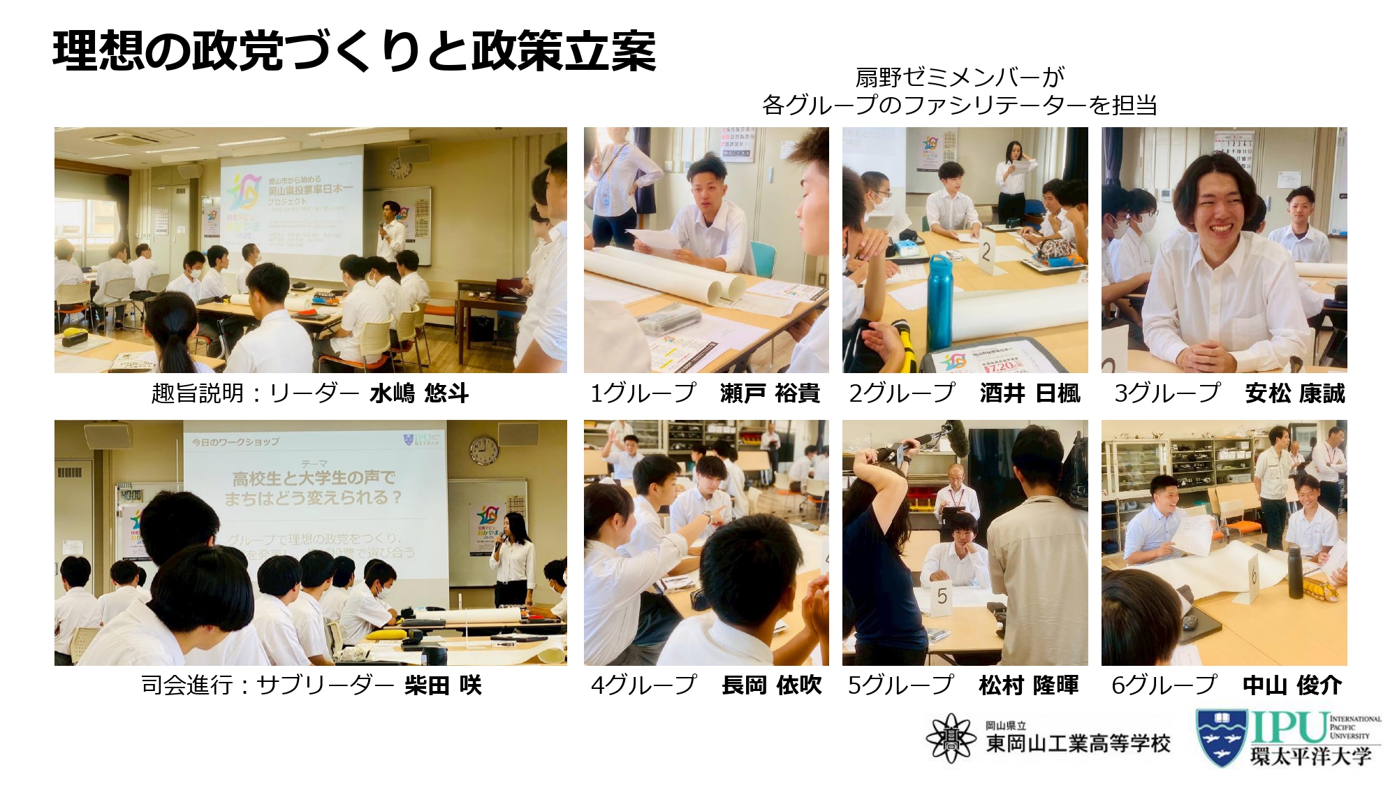環太平洋大学(以下/IPU)岡山県立東岡山工業高等学校(以下/東岡工)と連携し、PBL型(Project Based Learning)での授業を実施。 6チームに分かれて「まちを良くするための理想の政党」をつくるワークショップに挑戦しました。
