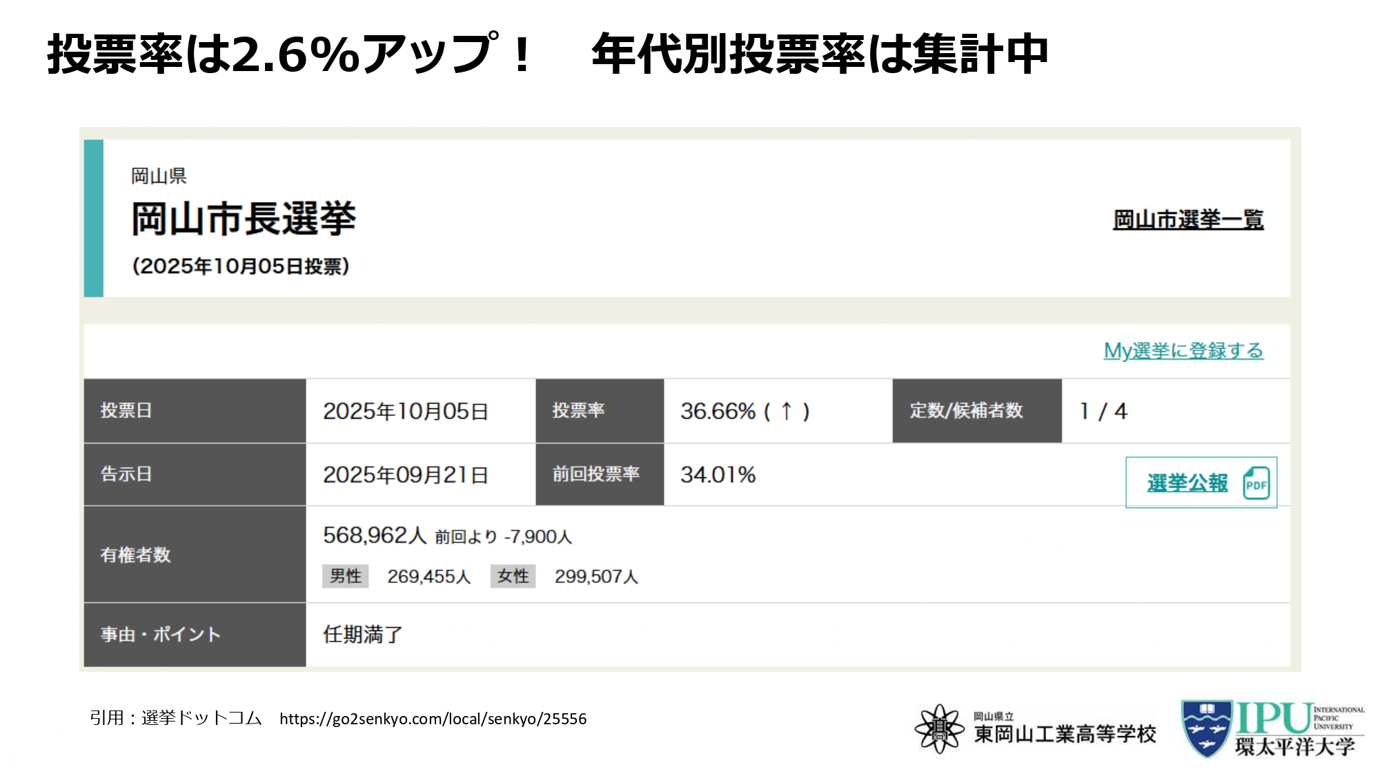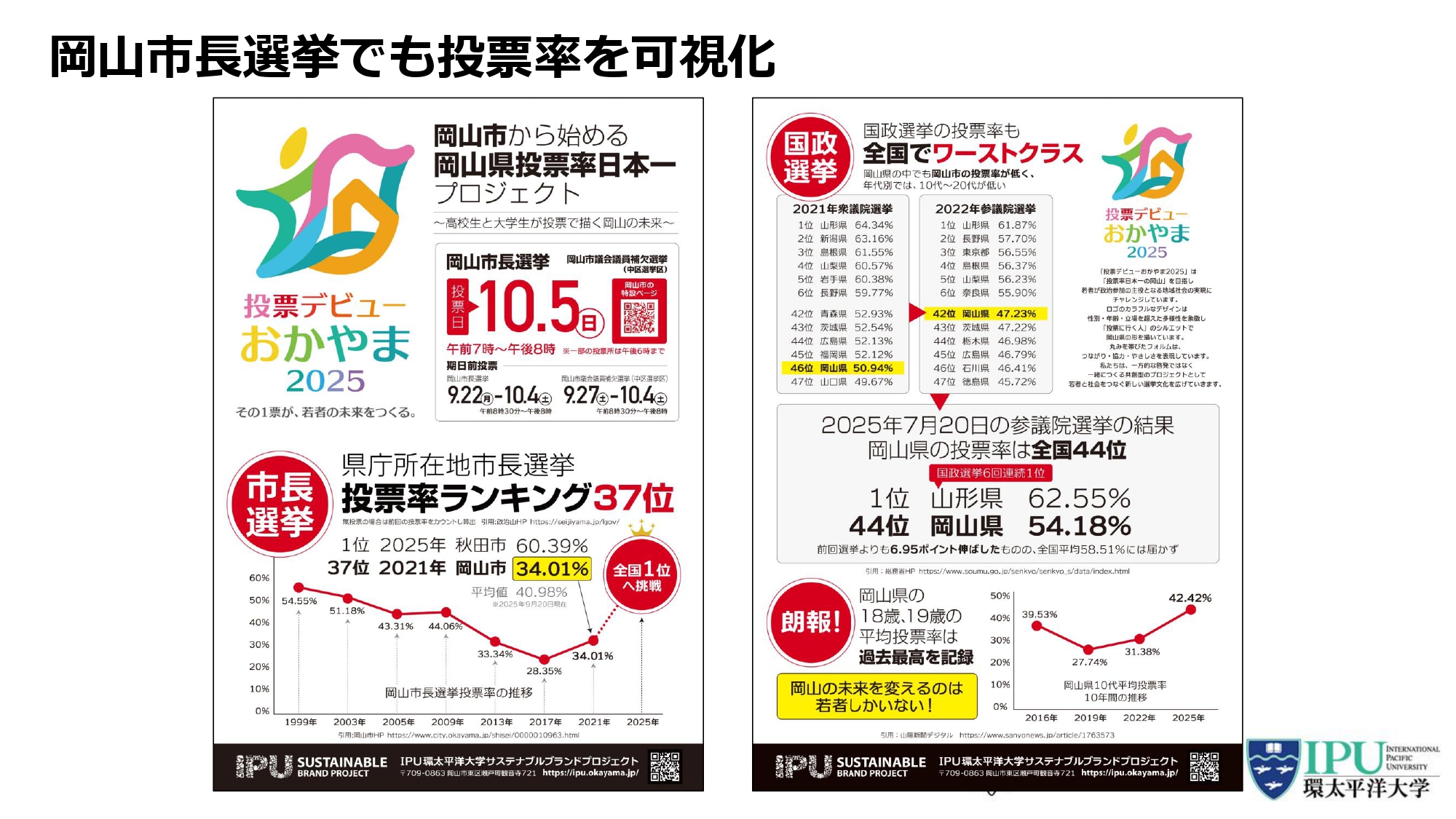 また岡山市長選でも、投票率を可視化したチラシを岡山市内の高校へ持参し、生徒との対話を通じて投票文化の醸成にも取り組みました。