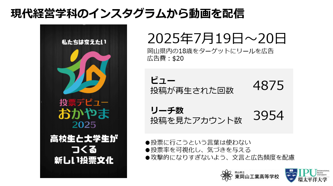 など“学びを支える役割”を担当し、一方的な指導ではなく楽しく一緒に考える時間のデザインを重視しました。また、現代経営学科のInstagramでは、投票率の可視化を通じた気づきを促すリール広告を、県内の18歳に絞って配信し、約5,000回再生を記録。広告費20ドルという小さな投資で大きな波及効果を生みました。