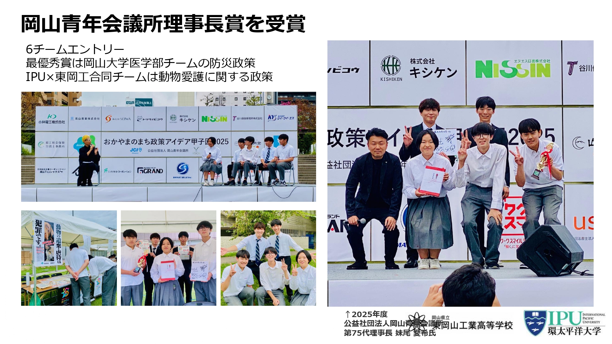 活動はさらに拡張し、岡山青年会議所主催「おかやまのまち政策アイデア甲子園」に、IPUと東岡工の合同チームで参加。動物愛護をテーマとした政策案が高く評価され、理事長賞を受賞しました。