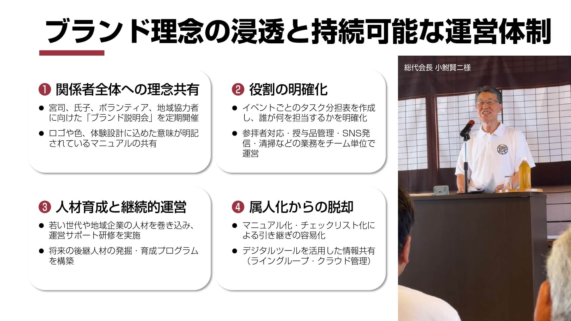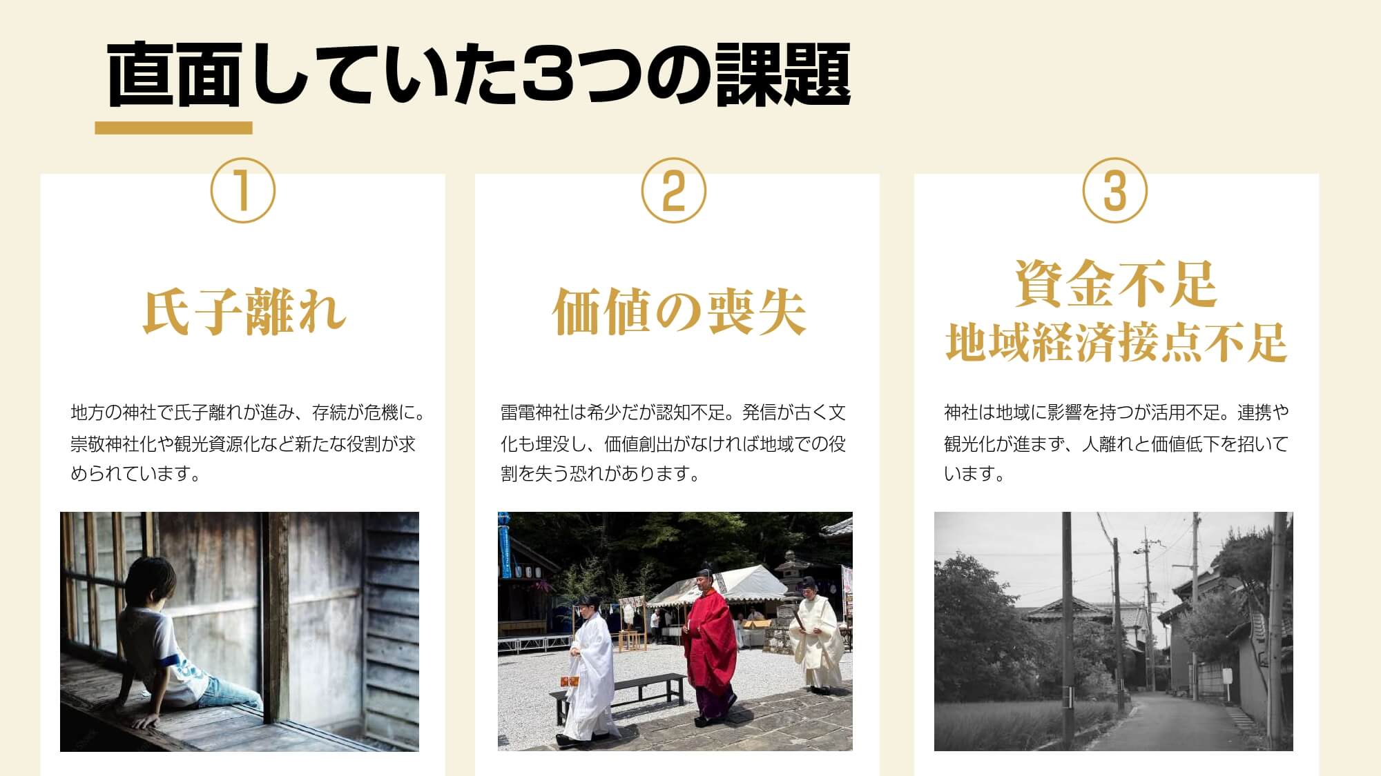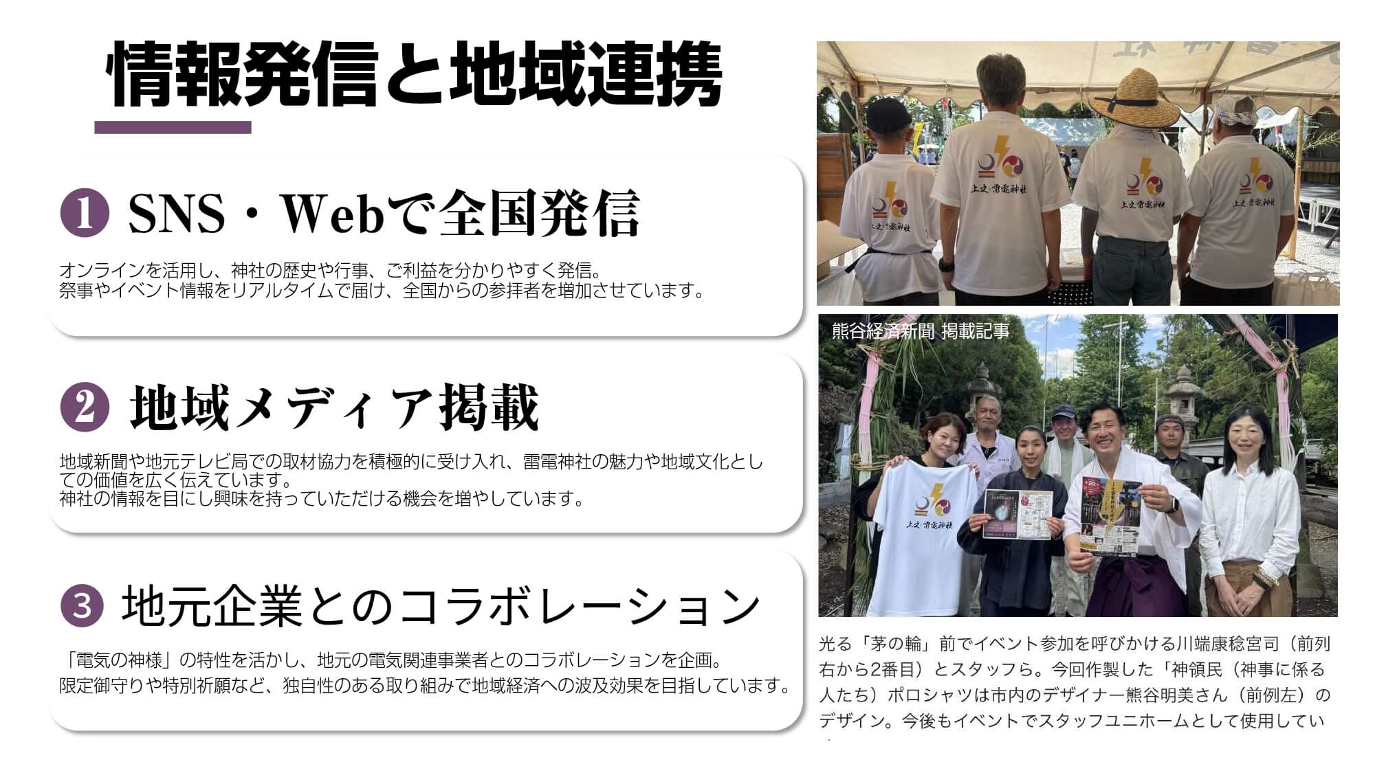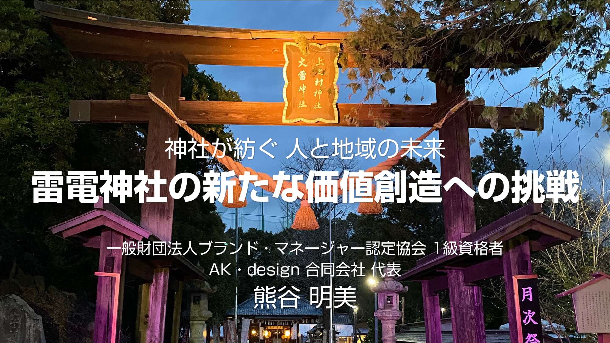 「神社が紡ぐ人と地域の未来 雷電神社の新たな価値創造への挑戦」は、古くから地域に根差す神社が継承・発展の道を選び、氏子離れや地域経済との接点不足などの課題解決に挑戦した事例です。埼玉屈指の由緒を持ち「電気の神様」として知られる上之雷電神社では、「氏子離れ」「価値の喪失」「資金不足と地域経済との接点不足」という3つの課題に直面しており、存続の危機にあったことから、ブランディングの取り組みを開始。“ことあげせず”という慣習的な考え方を変えて、氏子だけに頼るのではなく、神社の価値を社会へ伝えることに挑戦しました。