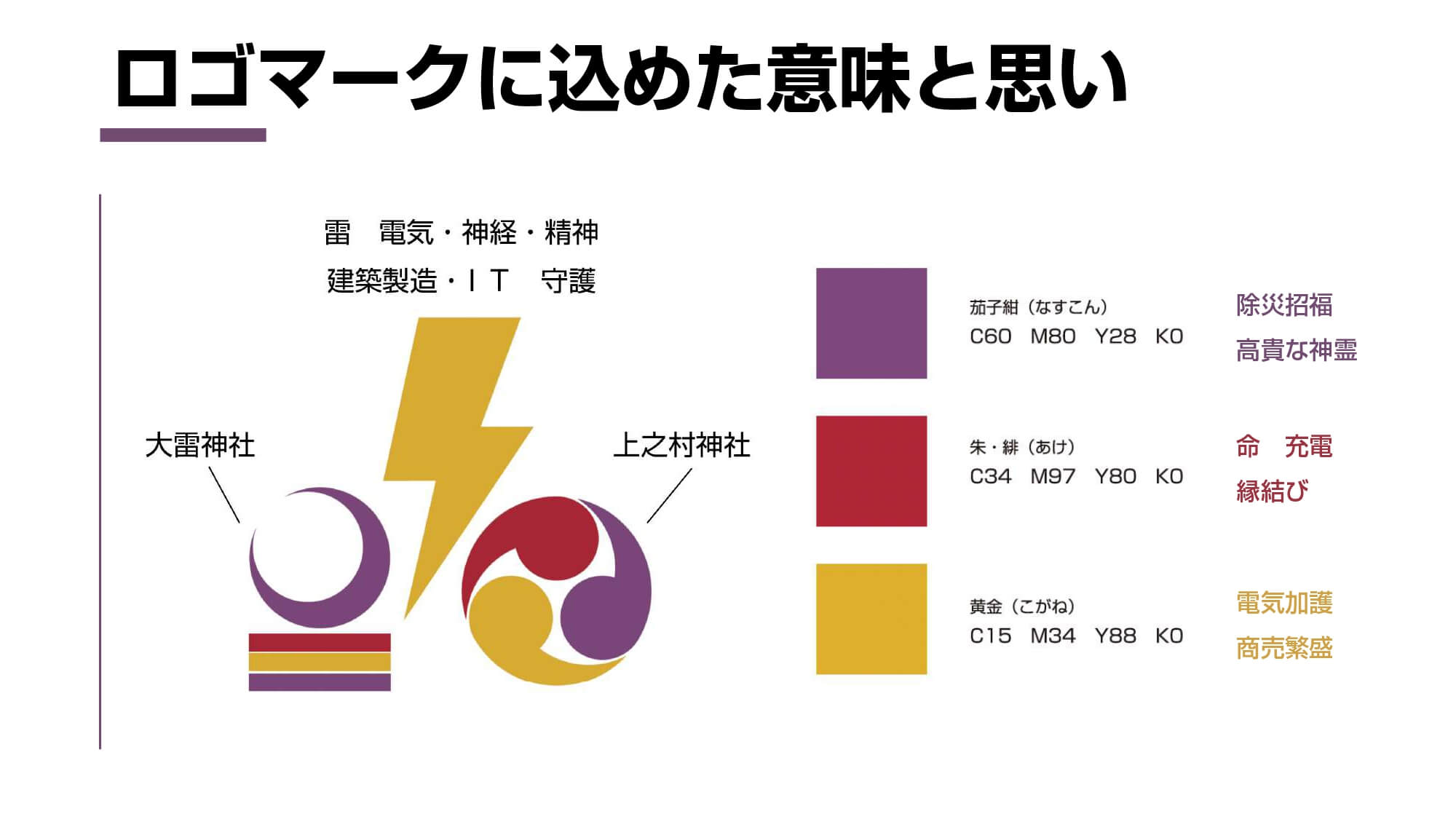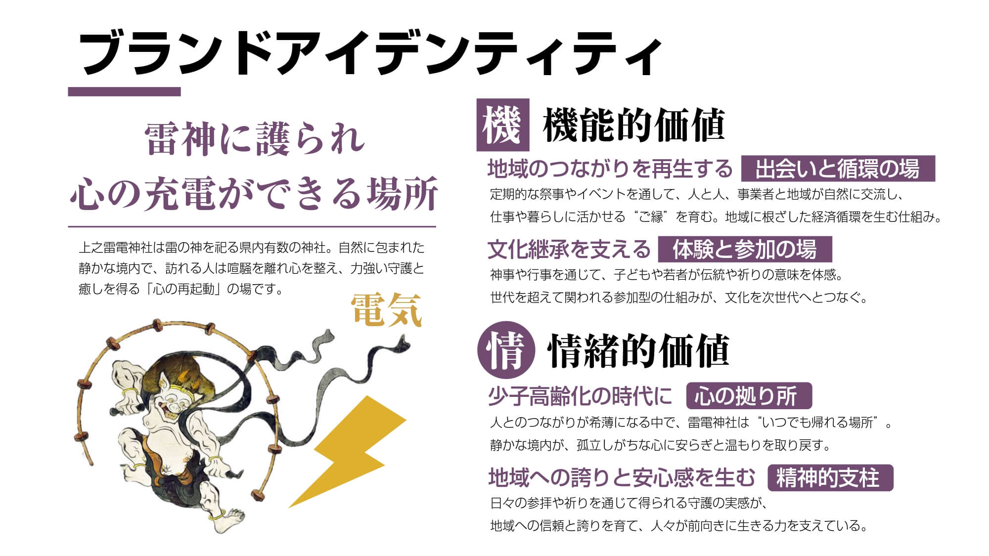 ブランド・アイデンティティは「雷神に護られ、心の充電ができる場所」とし、機能的価値は「地域のつながりを再生する出会いと循環の場」「文化継承を支える体験と参加の場」、情緒的価値には「少子高齢化の時代に心の拠り所」「地域への誇りと安心感を生む精神的支柱」を挙げました。また、視覚的なブランド展開として、2つの社印の間に雷マークを配して安定感と調和を表したロゴを設計。ロゴでは黄金、茄子紺、朱緋色の3色で電気加護や商売繁盛、除災招福、高貴な神霊、命、充電、縁結びなどを表現しました。