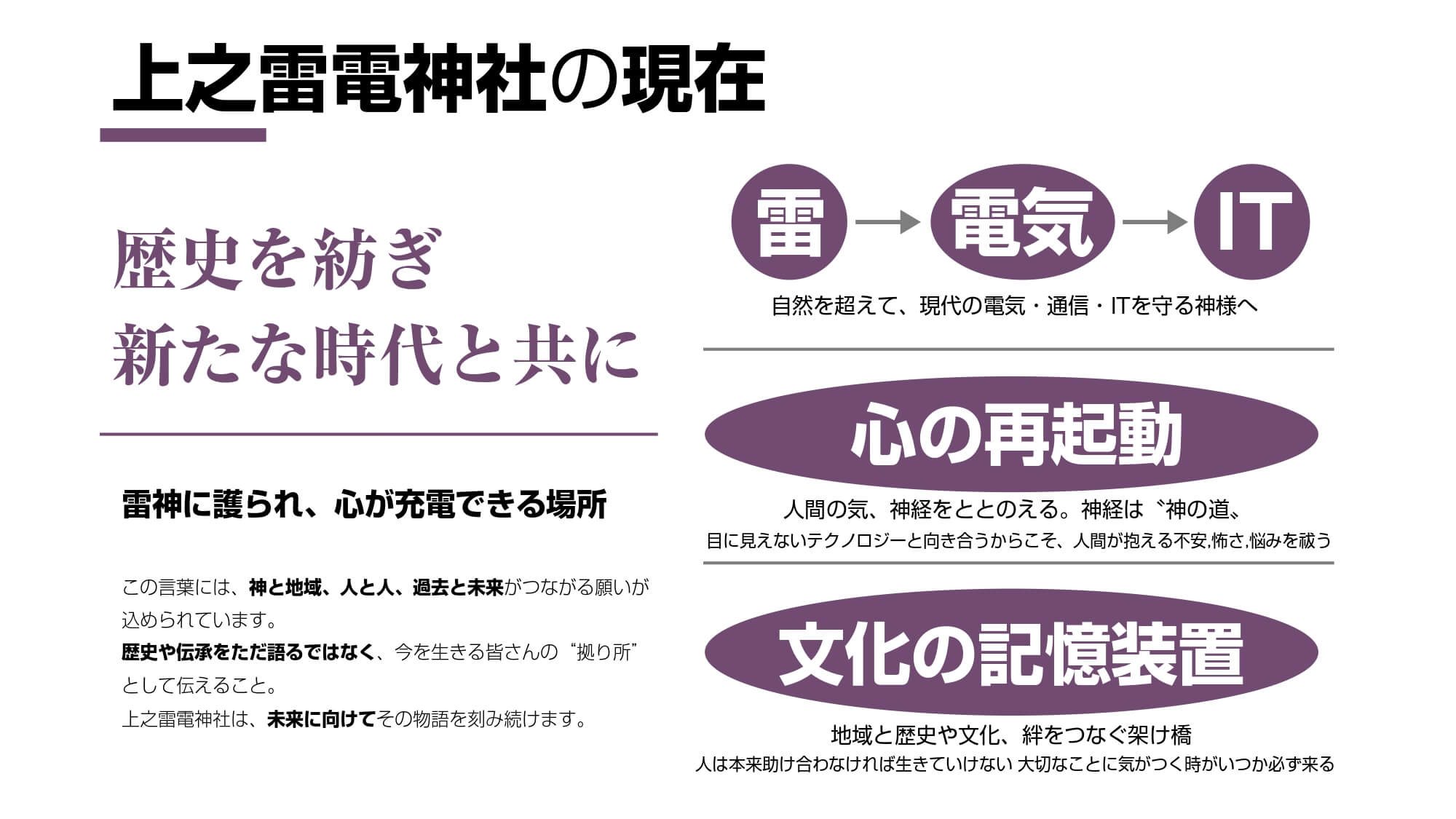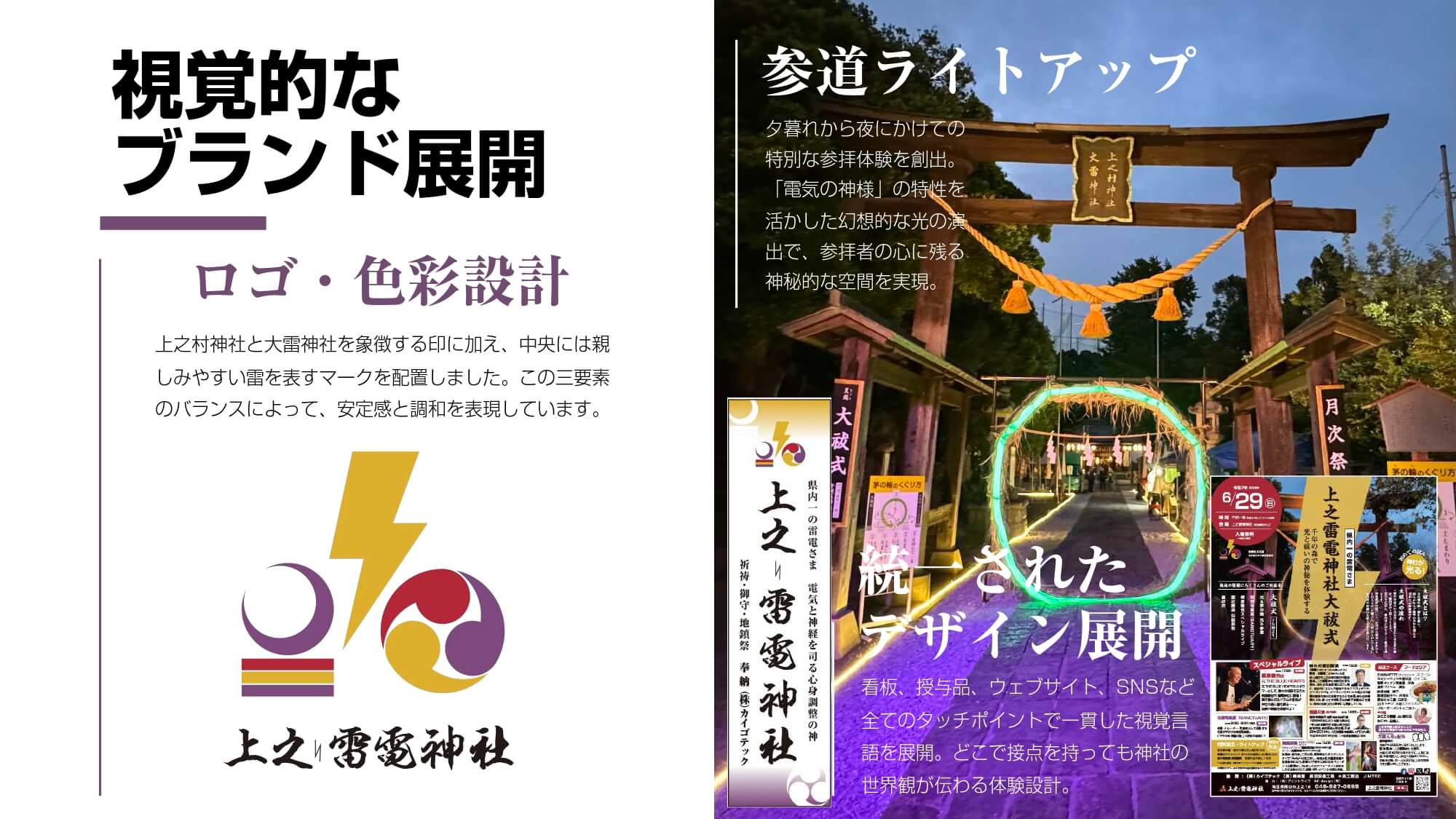 上之雷電神社は「電気の神様」として古くから地域に根差し、現代では電気・通信安全祈願など新たな価値を提供。ロゴをはじめ看板等の視覚イメージの新規導入、地域企業との連携や催しを通じて若年層や家族層の参拝が増加し、地域経済へも波及。伝統と革新を融合したブランディングで、地域共創の輪を広げています。