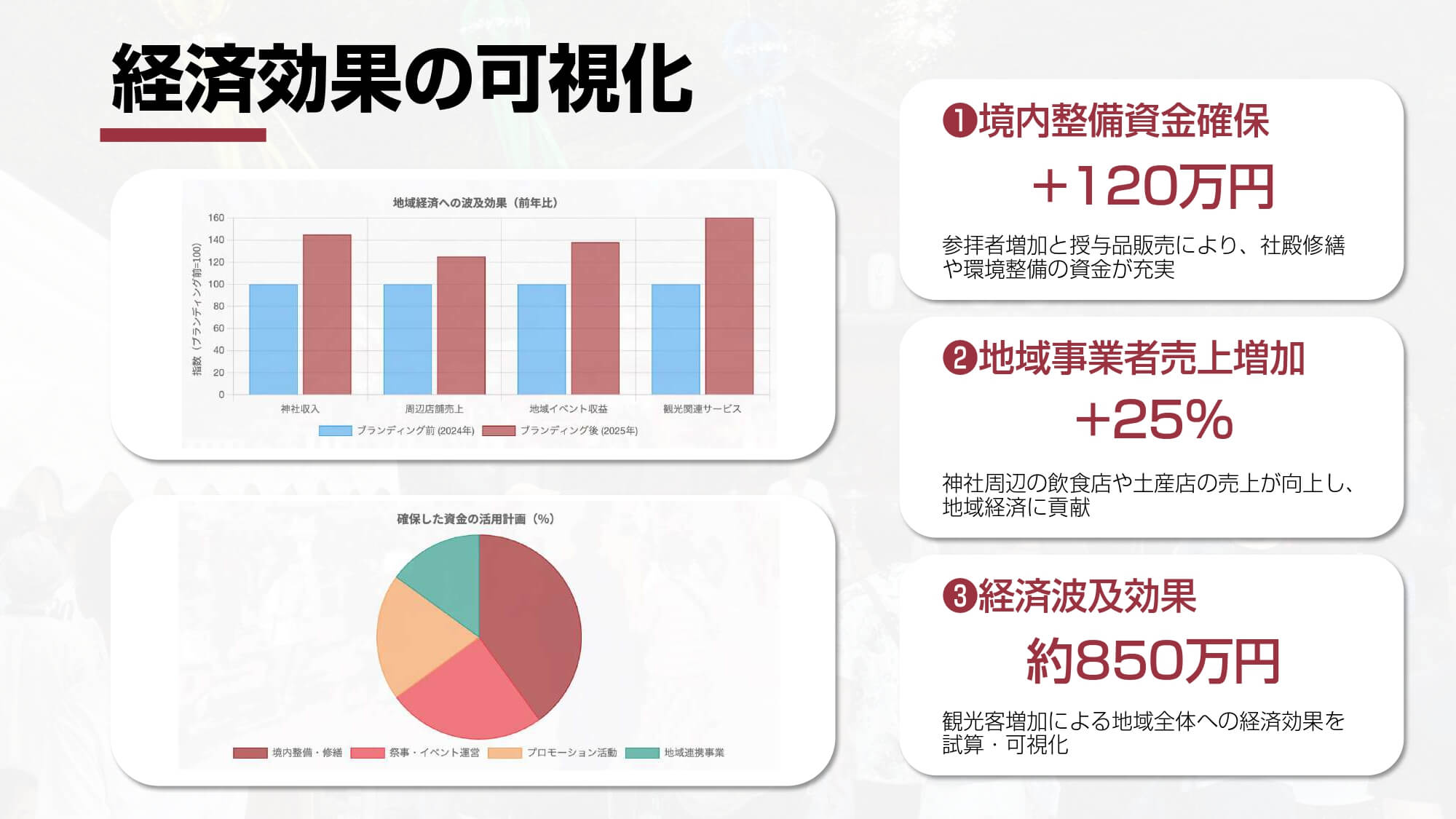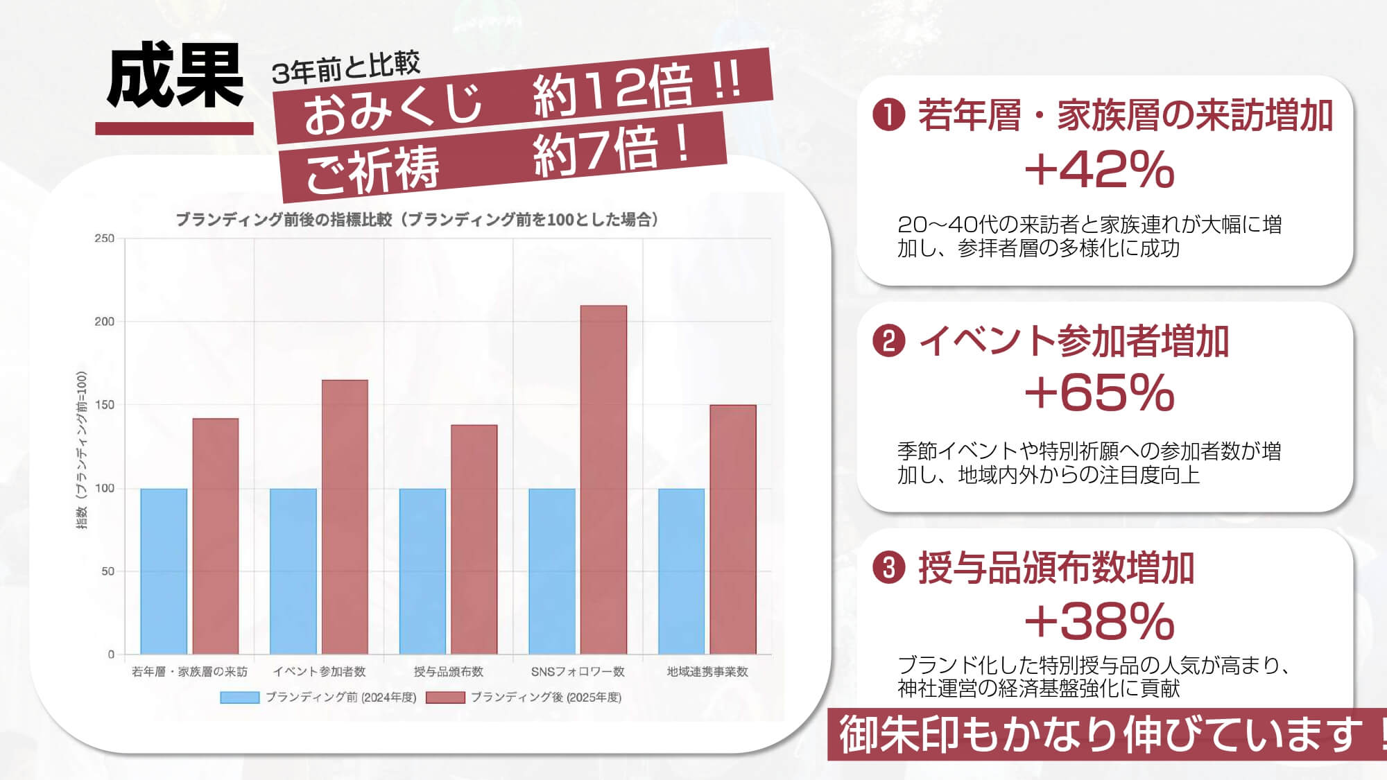 こうしたブランディングにより、若年層や家族連れの来訪が大幅に増加。イベント参加も増え、3年前との比較でおみくじは12倍、ご祈祷は7倍に増加しました。また、毎日参拝者があり、神社境内の空気が変化。境内整備資金の確保にも成功し、地域のイベントでの店舗売り上げも向上。観光客の増加により約850万円の経済波及効果を生みました。
