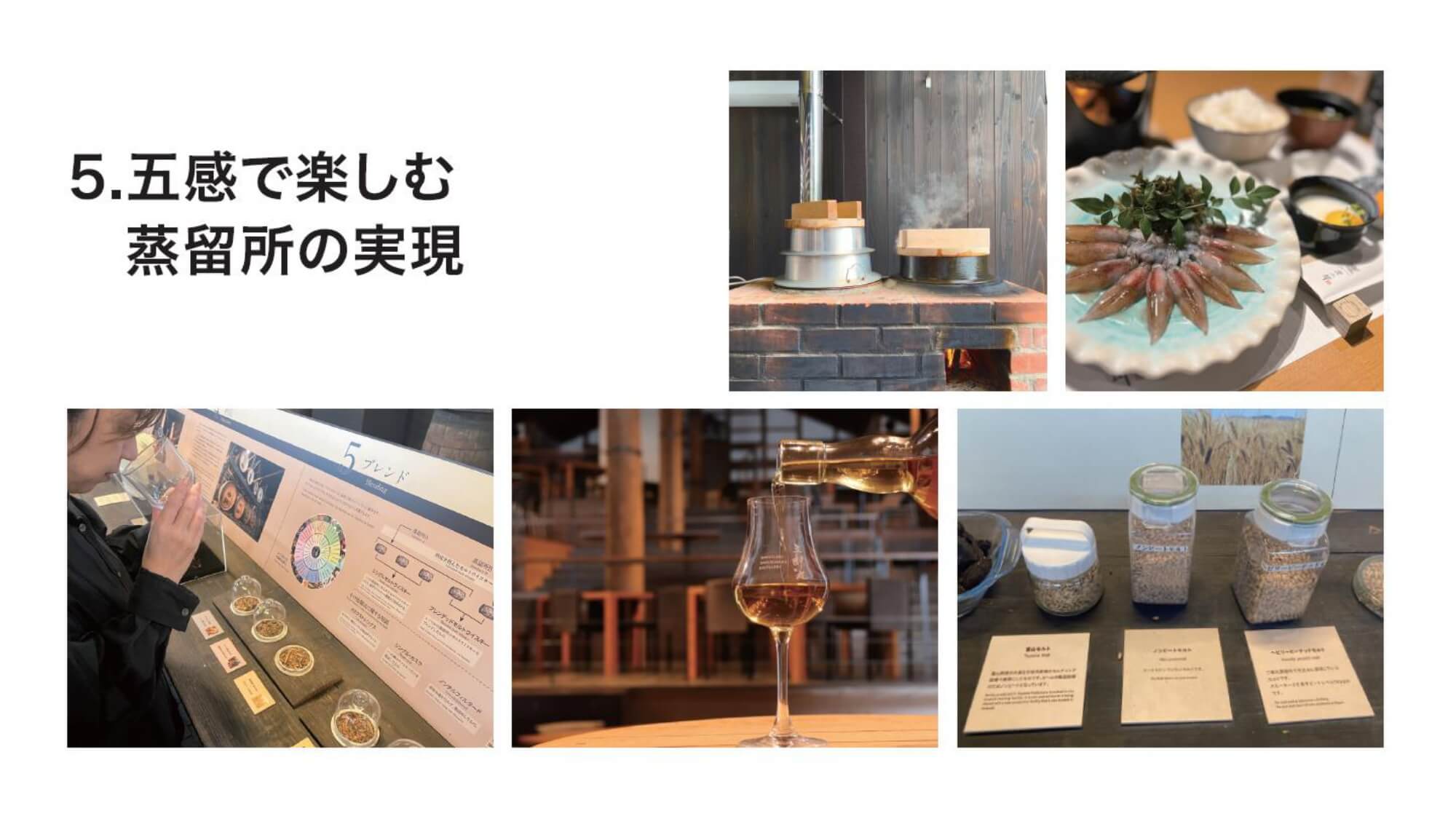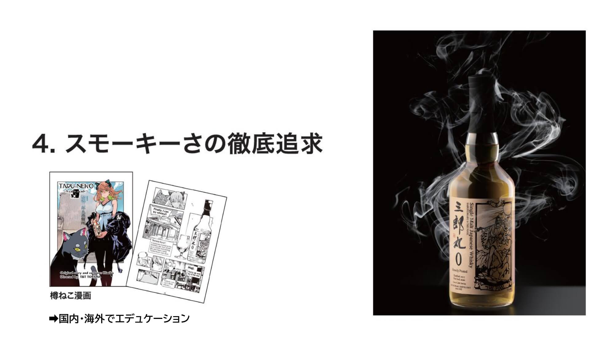 そこで市場機会を検討し、「スモーキーという希少な個性と富山・三郎丸の地域性を融合させれば、国内外のプレミアム層に選ばれる唯一無二のブランドを確立できるのではないか」と仮説を構築。「社内浸透と一体感」「地域との共生」「長く愛されるブランドの確立」を目指しました。まずは社長と社員とともにブランド・アイデンティティを策定。プロセスを共に歩むことでトップと現場のギャップを埋めました。ブランド・アイデンティティは「地域に拠って、世界に立つ。」とし、ロゴマークも刷新。三郎丸ならではのパッケージも作成しました。商品は「スモーキーさの徹底追求」を国内外でアピール。また、五感で楽しむ蒸留所の実現や、富山の技や素材が調和した空間でのワークショップ体験など、「モノ」から「コト」提供へシフト。蒸留所の垣根を越えてボトラーズ事業を立ち上げ、樽再生事業もスタートしました。