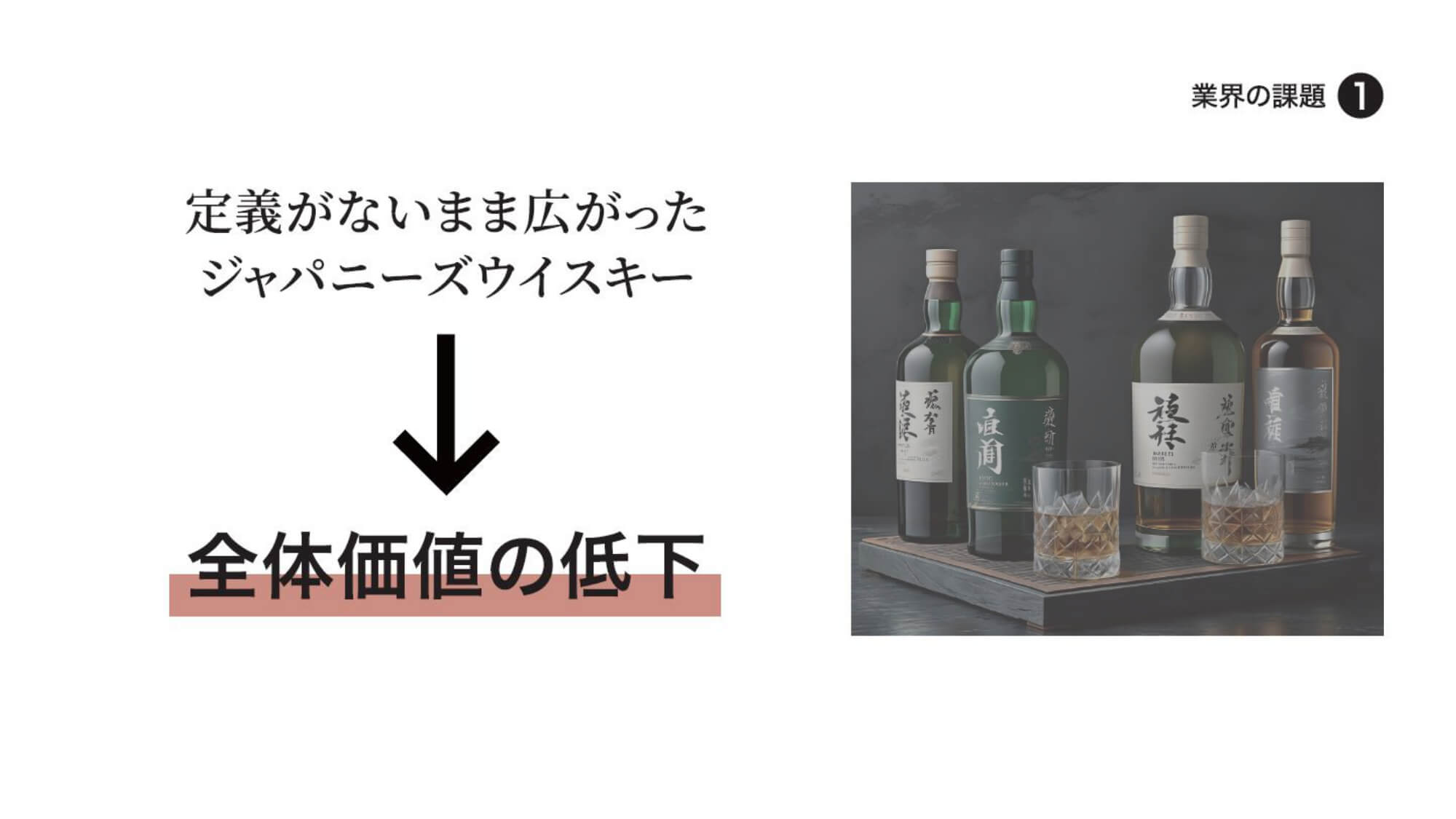 「富山から世界へ 地域を巻き込むブランド戦略」は、北陸最古のウイスキー蒸留所がスモーキーという独自性を核にブランドを確立した事例です。1862年創業の若鶴酒造の5代目社長は、55年前に蒸留されたウイスキーに衝撃を受け、北陸唯一の蒸留所を未来につなぐ“繋ぎ手”となることを決意。ただ、ブーム終焉後の需要減への懸念や、新規参入が急増したことによる差別化、ブランド認知度などの課題があり、社内でも社長が描くビジョンに現場がついてこれないなどの課題がありました。加えて、市場の急成長でジャパニーズウイスキー全体の価値が低下するという業界的な課題や、伝統工芸の衰退で町の魅力が薄れつつあるという地域の課題もありました。
