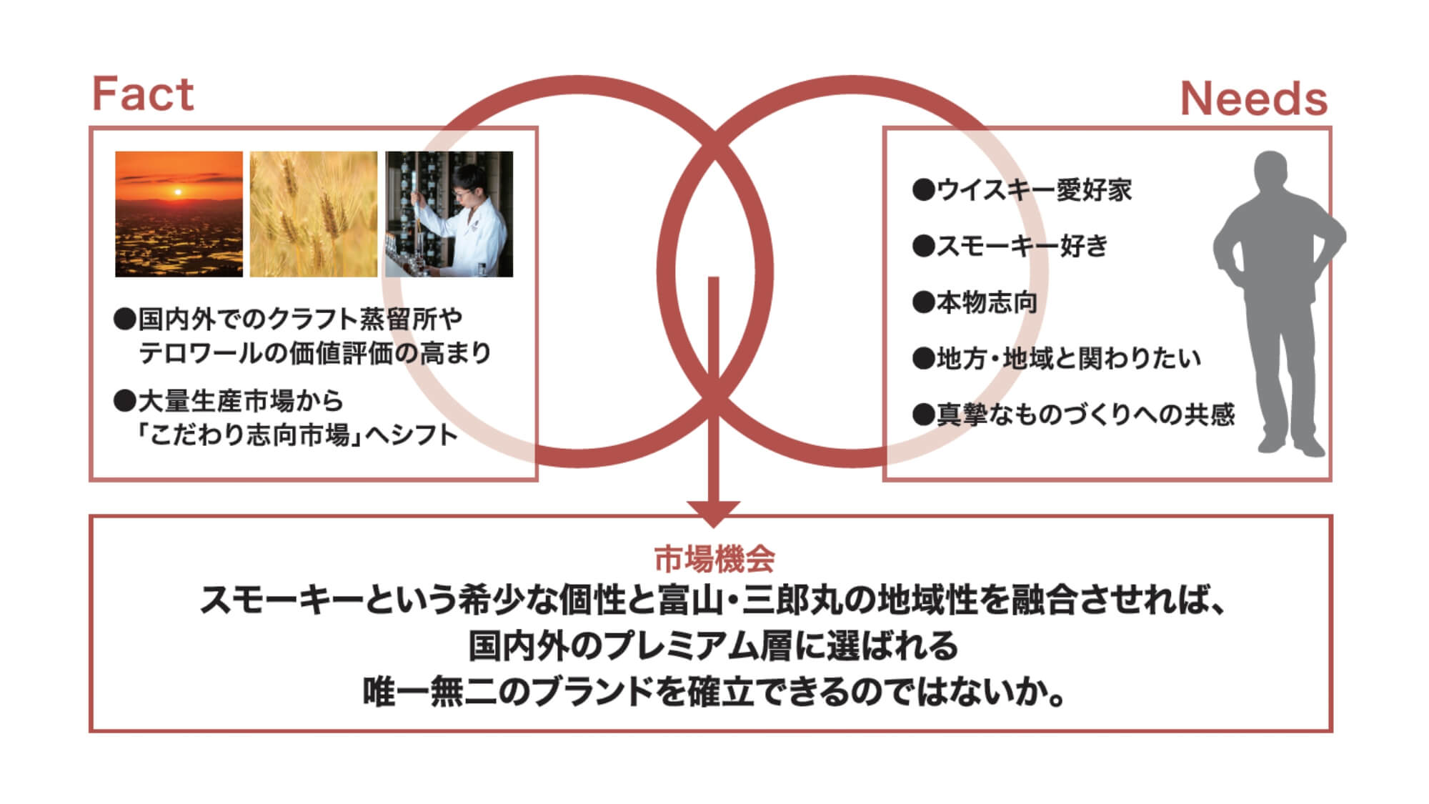 三郎丸蒸留所は、加熱するウイスキーブームに依存せず、長く愛されるブランドの確立を目指した。課題整理を経て「地域に拠って、世界に立つ」のブランドアイデンティティを策定。スモーキーな個性の明確化、地域資源を活かした商品・体験づくりに加え、業界の持続可能性を支える事業を実行した。独走ではなく、地域や業界と共創しながら発展していく姿勢を貫き、売上6倍・輸出8倍・35カ国展開という成果を実現した。