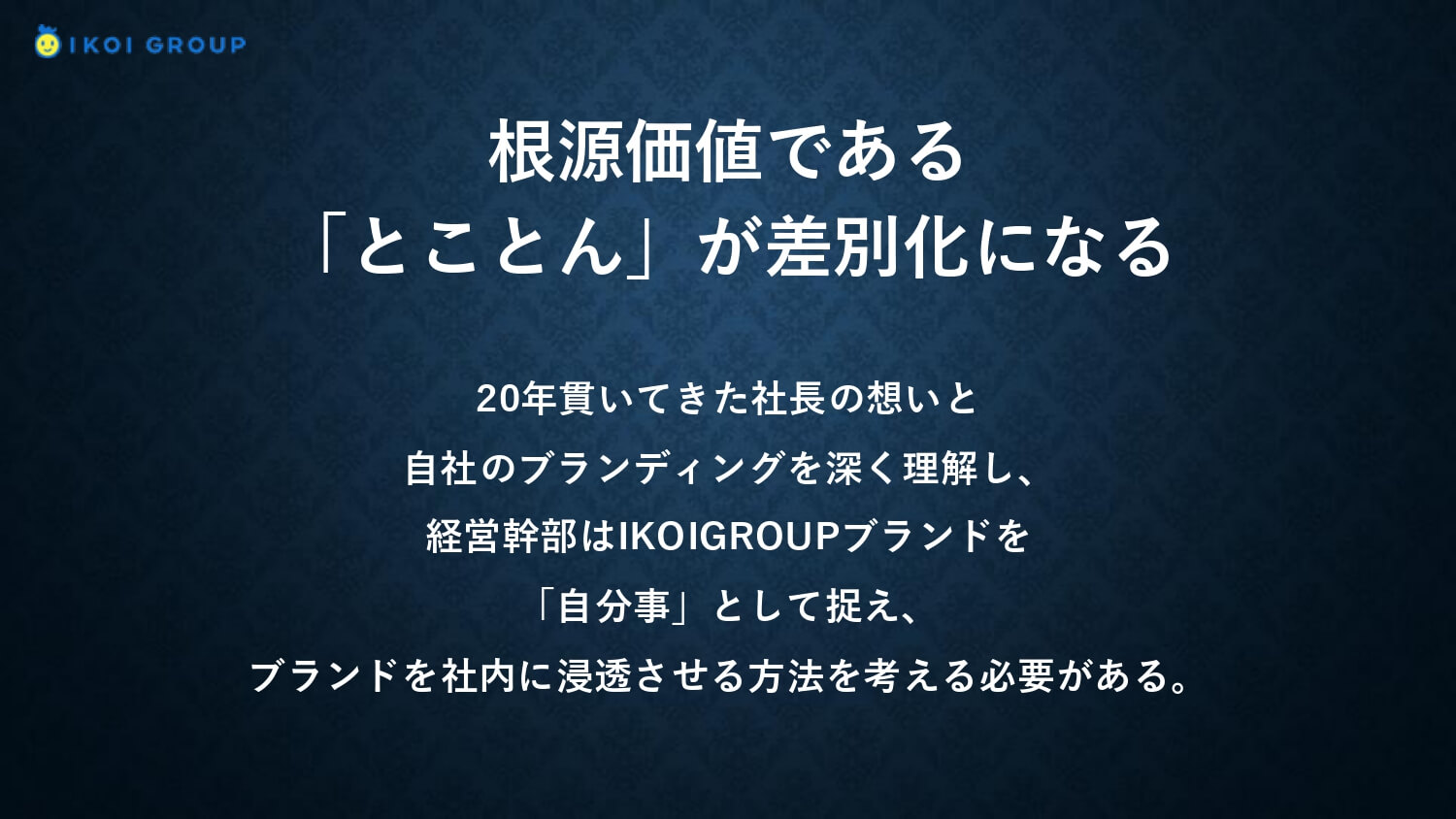 「根源価値は揺るがない──「とことん」が世代を繋ぐインターナルブランディング」は、医療福祉の総合支援企業であるIKOI GROUPにおいて、足掛け12年にわたり3期に分けて実施したインターナルブランディングの取り組みです。その成功の要因は、事業成長の節目ごとに表面化する課題に対して、ブランディングの専門家を起用し解決してきた点にあります。