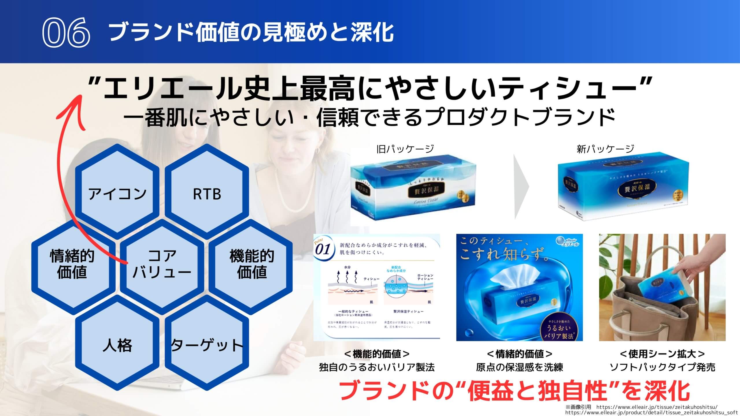 「逆境を乗り越える贅沢保湿ティシューのリブランディング」は、製紙・日用品メーカーの大王製紙が自社製品のリブランディングに取り組んだ事例です。風邪・花粉の時期に需要が高まる保湿ティシュー市場は、コロナ禍でのマスク着用・リモートワークの増加で低迷。そこでトップメーカーの同社は、発売から約30年となる「エリエール 贅沢保湿ティシュー」の次世代に合わせたリブランディングに着手しました。